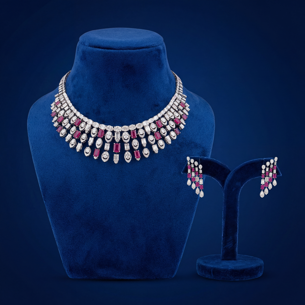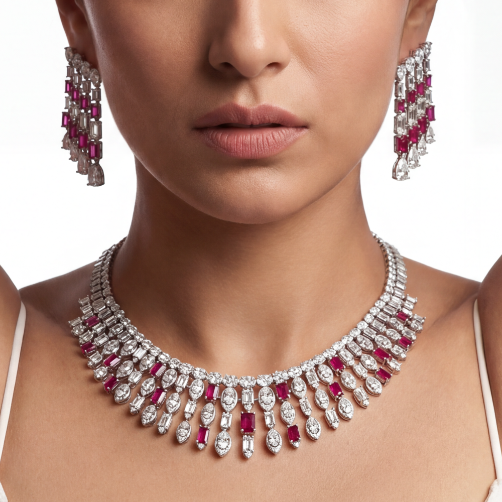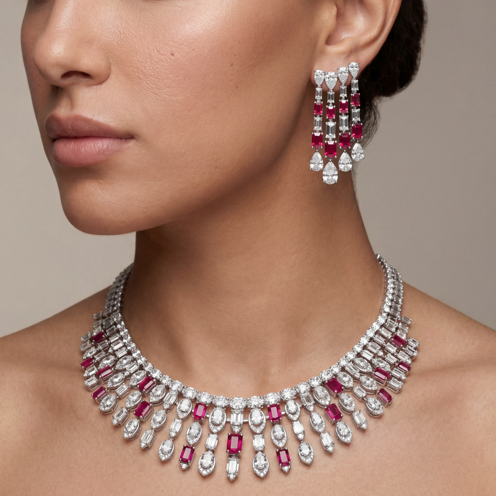 A statement piece that exudes luxury, the necklace features a cascading arrangement of meticulously set diamonds and vibrant rubies, creating a regal and eye-catching silhouette.