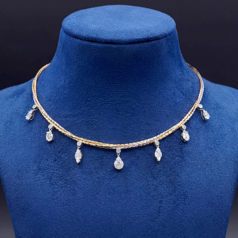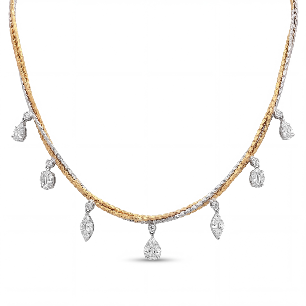 Gracefully blending contemporary elegance with timeless craftsmanship, this exquisite dual-tone diamond necklace is designed to make a refined statement. Crafted in luxurious 18K gold, the piece features a beautifully intertwined yellow and white gold chain that adds depth and visual richness to its design.