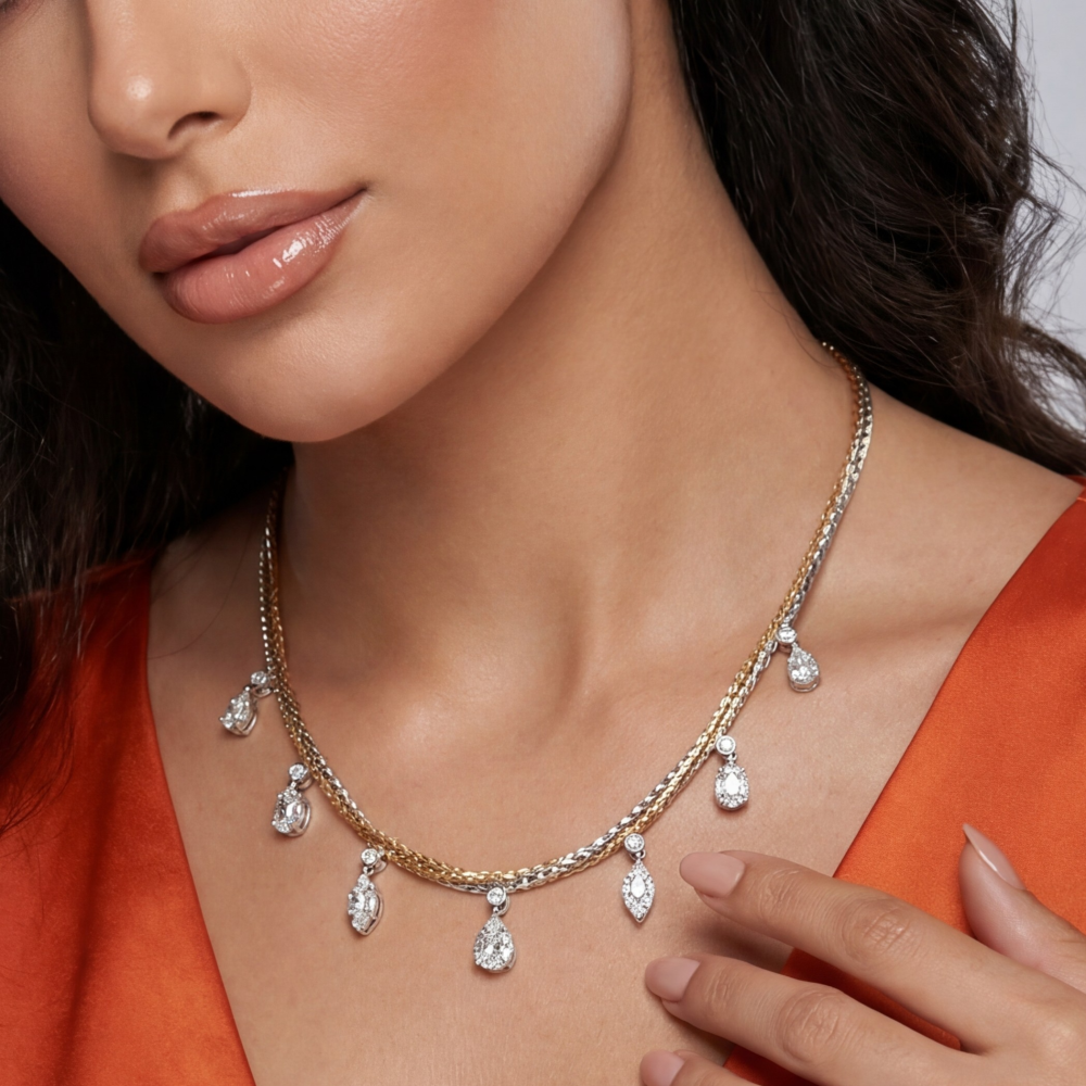 Adorned with delicately suspended diamond drops, each element is meticulously set to enhance brilliance and movement. The combination of pear-shaped and round diamonds creates a captivating play of light, giving the necklace a soft yet radiant sparkle with every movement.