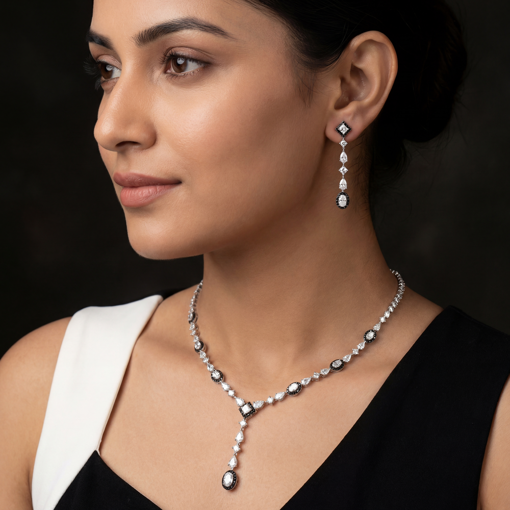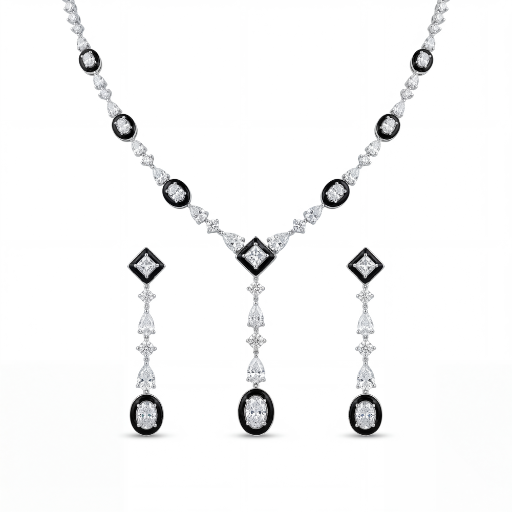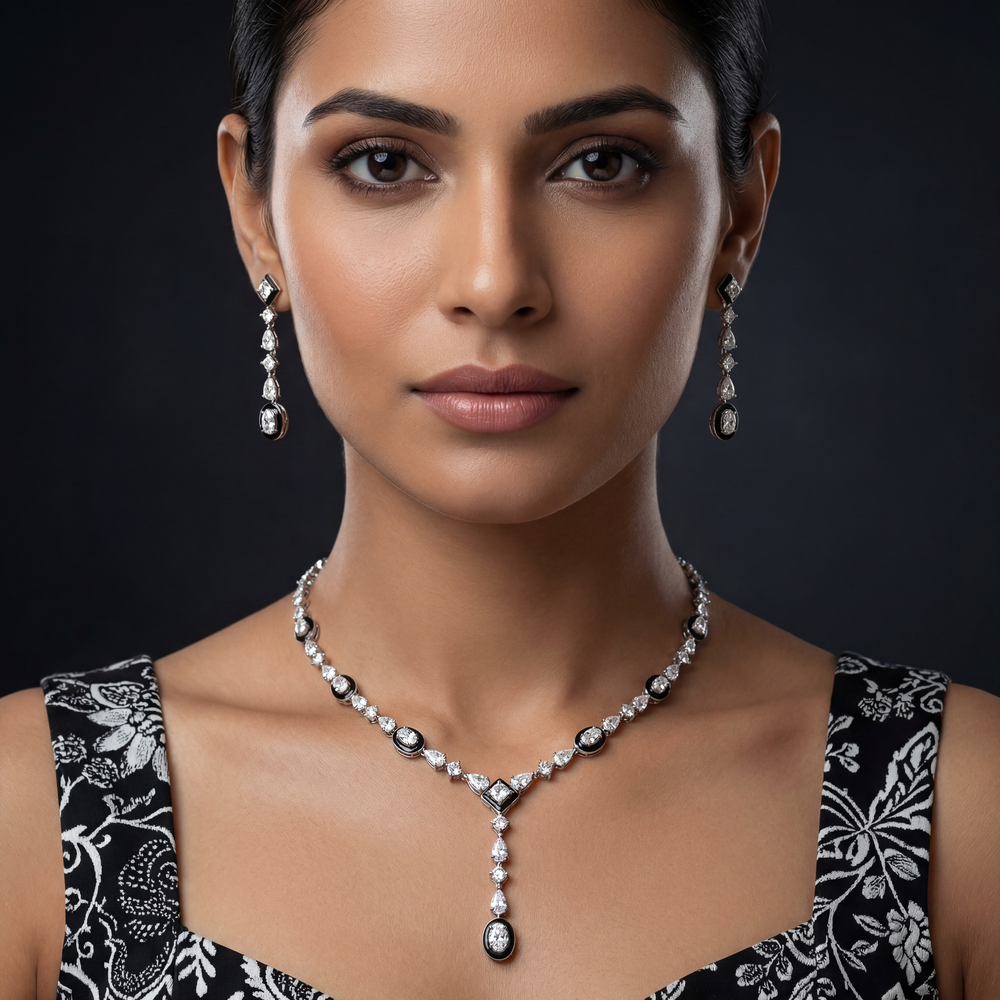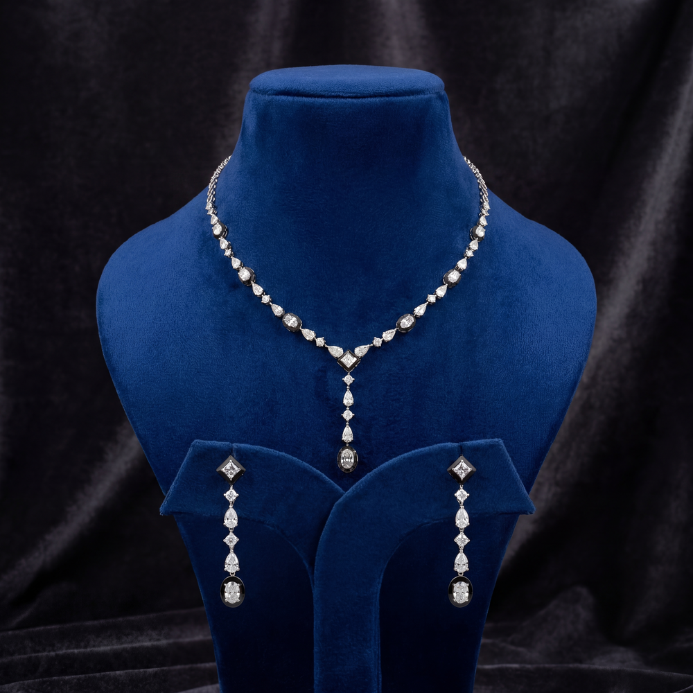 Crafted in luxurious 18K gold, this elegant diamond necklace set reflects timeless sophistication and refined craftsmanship. Featuring a graceful design adorned with oval, pear, and round-cut diamonds, it delivers exceptional brilliance and a premium finish.