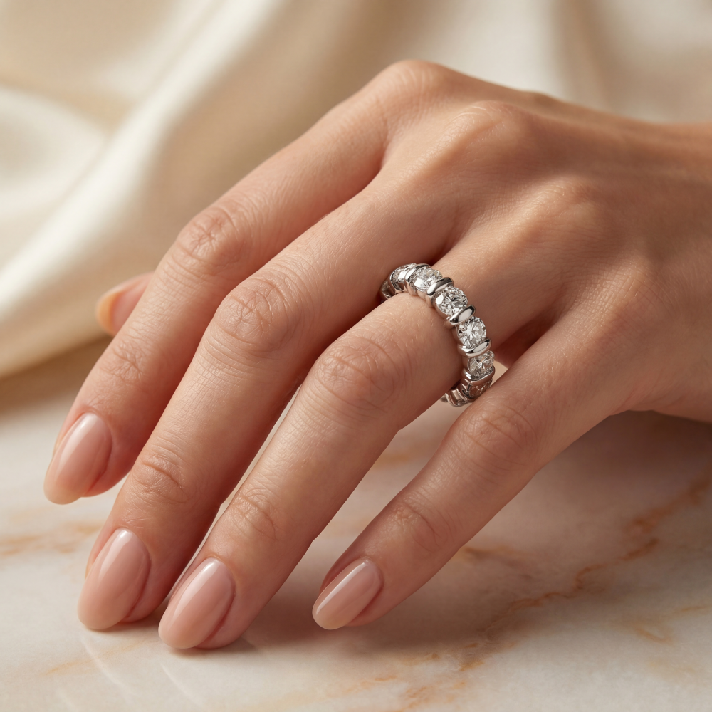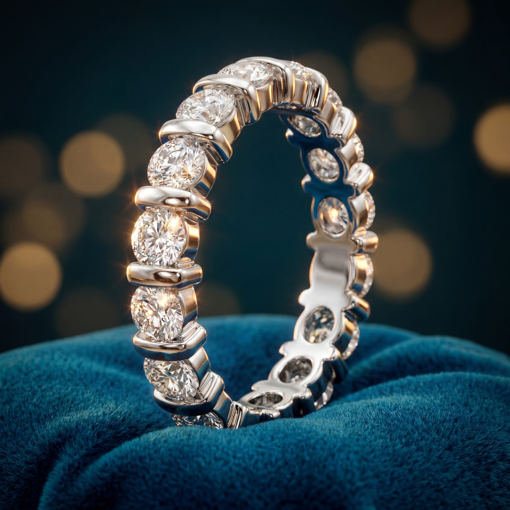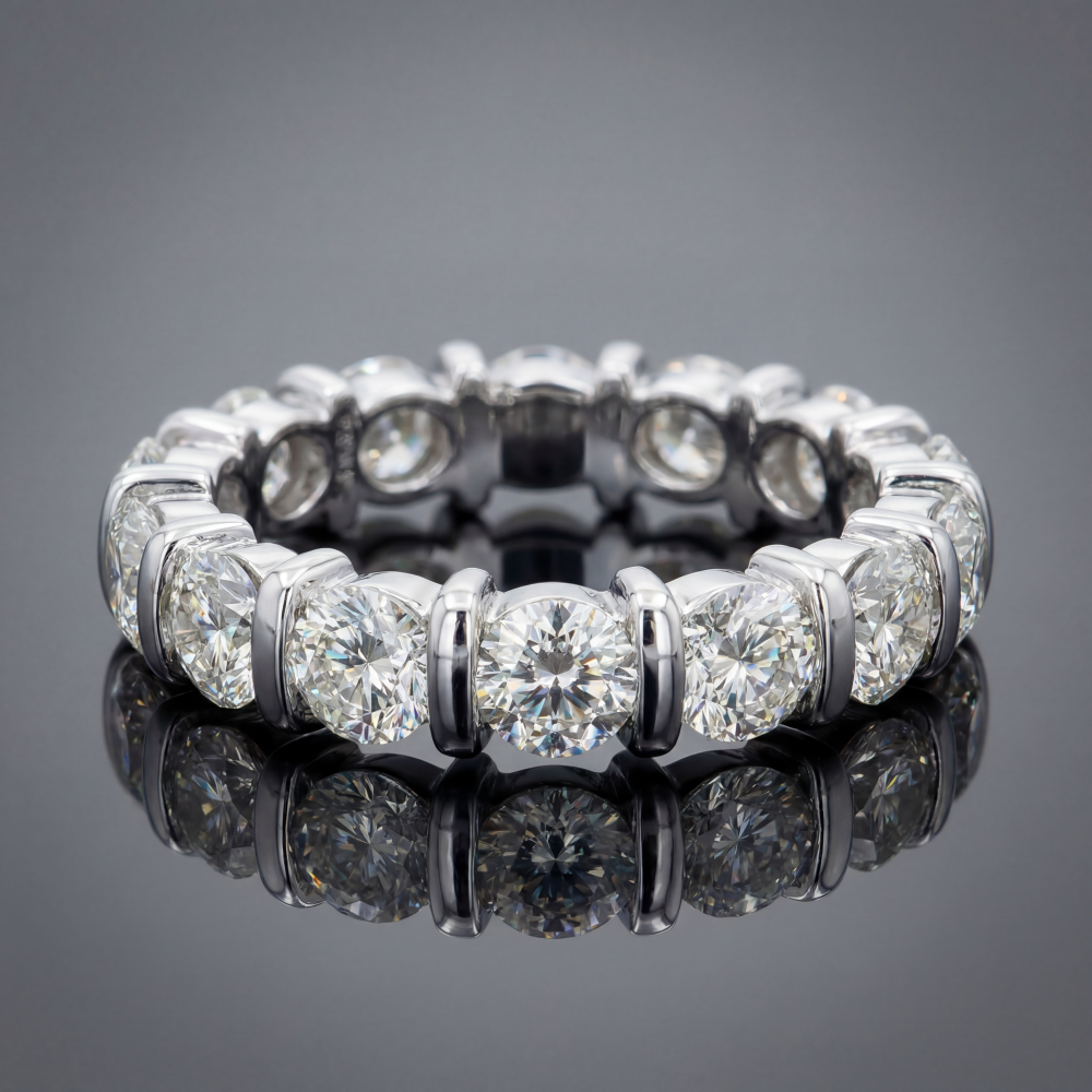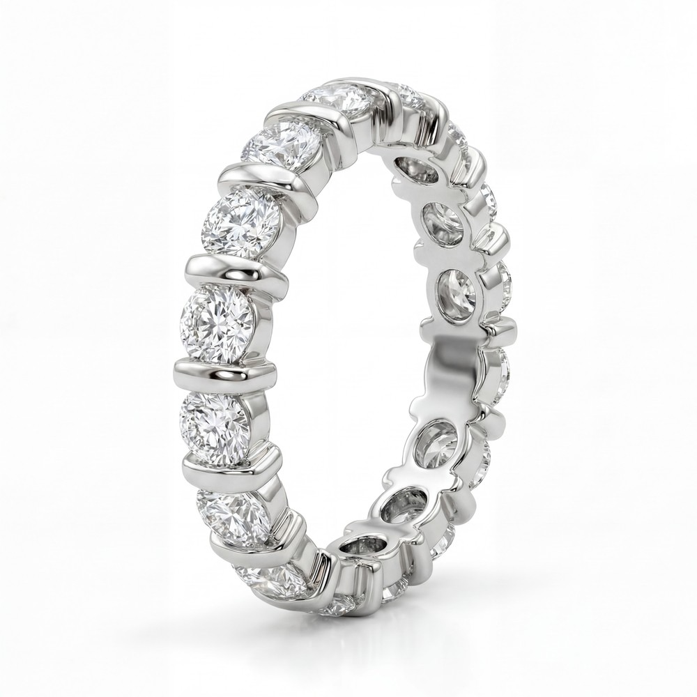 The beauty of this eternity band lies in its architectural bar-setting. By using slim metal bars to secure the diamonds, the design minimizes heavy prongs and maximizes the diamond’s surface area, allowing more light to enter and reflect. It is the perfect balance of bold structure and delicate sparkle, making it an ideal choice for a milestone anniversary or a high-impact wedding band.