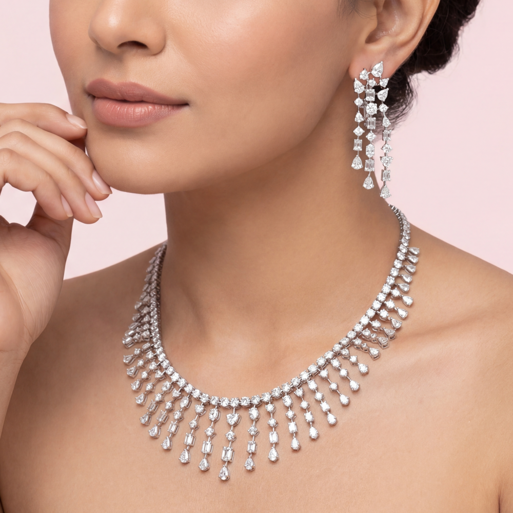 The necklace features a flawless arrangement of multi-cut diamonds, artfully layered to create a dazzling cascading effect. Its contemporary yet timeless design ensures maximum sparkle, making it a show-stopping centerpiece for any occasion. Each diamond is meticulously hand-set for precision, brilliance, and durability.