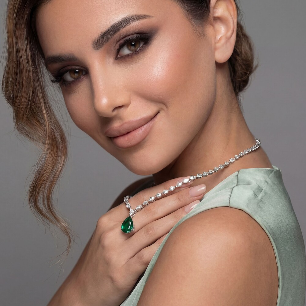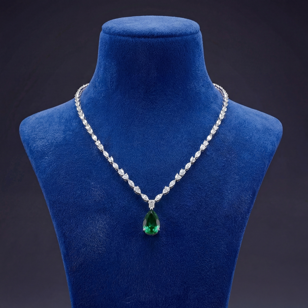 A striking expression of luxury, this 18K gold necklace showcases a seamless line of shimmering diamonds, gracefully leading to a bold pear-shaped emerald centerpiece. The vibrant green stone creates a captivating contrast against the brilliance of diamonds, delivering a look that is both modern and regal.